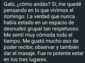No se realiza estimulación genital directa. El foco está en el masaje, el contacto profundo, el deslizamiento del cuerpo, la integración del pecho, la espalda, las piernas y el encastre como forma de comunicación erótica.